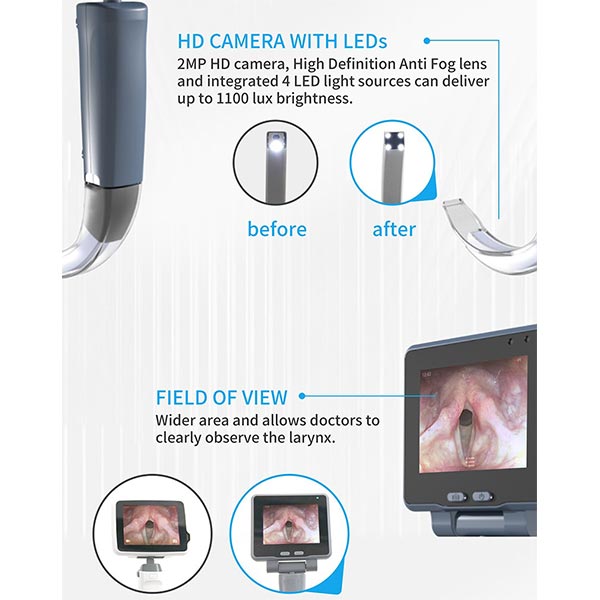3. Breites Sichtfeld: Wir haben den Betrachtungswinkel dieses Laryngoskops schön weit gestaltet, sodass Sie eine viel größere und klarere Sicht erhalten. Ärzte und Bediener können die Kehlkopfstruktur leicht erkennen, alle winzigen anatomischen Details erfassen und Eingriffe durchführen schneller und genauer erledigt